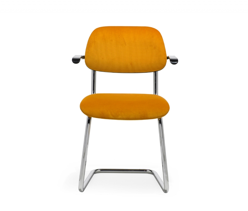 Wood, corduroy, bakelite, chrome. You could even recognise this chair with your eyes shut. You just have to think about the films of yesteryear, or the schoolroom before or after them, or the trendy family you used to know. And then think of all the possibilities and applications now.