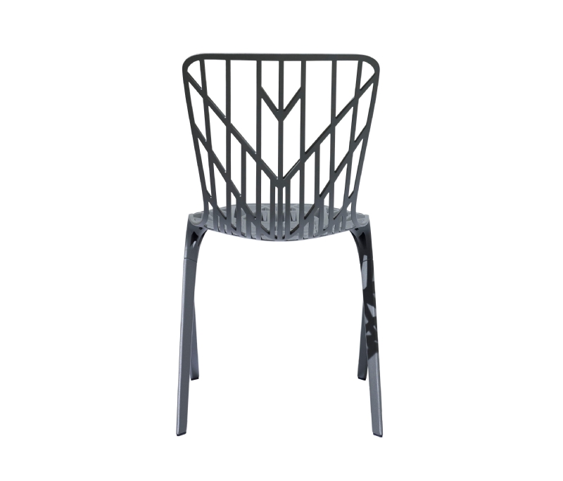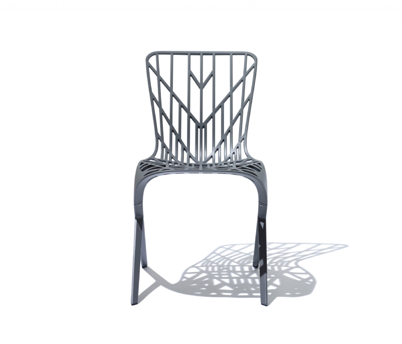 Constructed from die-cast aluminum, the chair's shell and legs are cast in three parts and are connected using mortise and tenon joinery and stainless steel fasteners. The chair features four nylon glides and is available in three finishes: ultra-durable outdoor powder coat paint in black, green and grey; a copper plated finish is also available in a natural state that allows the chair to patina with age.