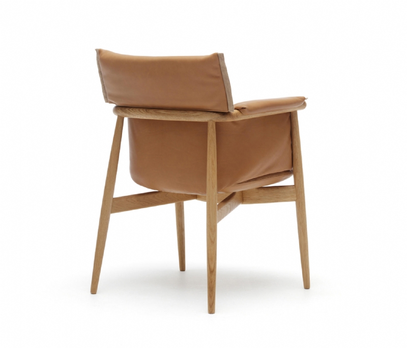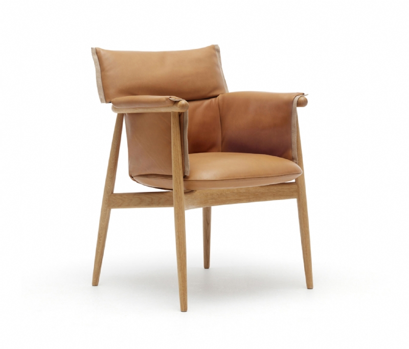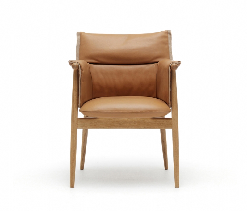 The Embrace Chair, E005, is available with a solid oak or walnut frame in a variety of finishes, and with leather or fabric upholstery. The upholstery and edging strip is available in various combinations.