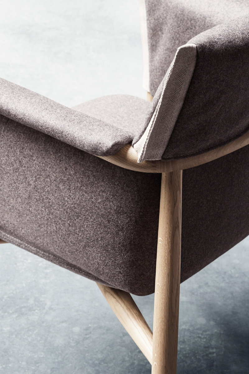 The soft cushion is folded into three dimensions and functions as a seat, back and armrests in one. The upholstery embraces the wooden structure, with the seat and back appearing to float inside the chair.