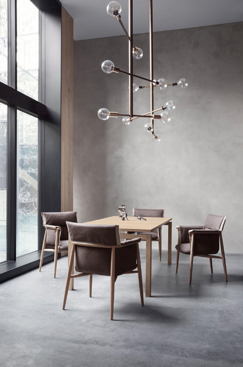 The Embrace Chair fuses a wooden structure and soft upholstery to create an elegant dining chair that is so expressive that it can function as a stand-alone piece as well.