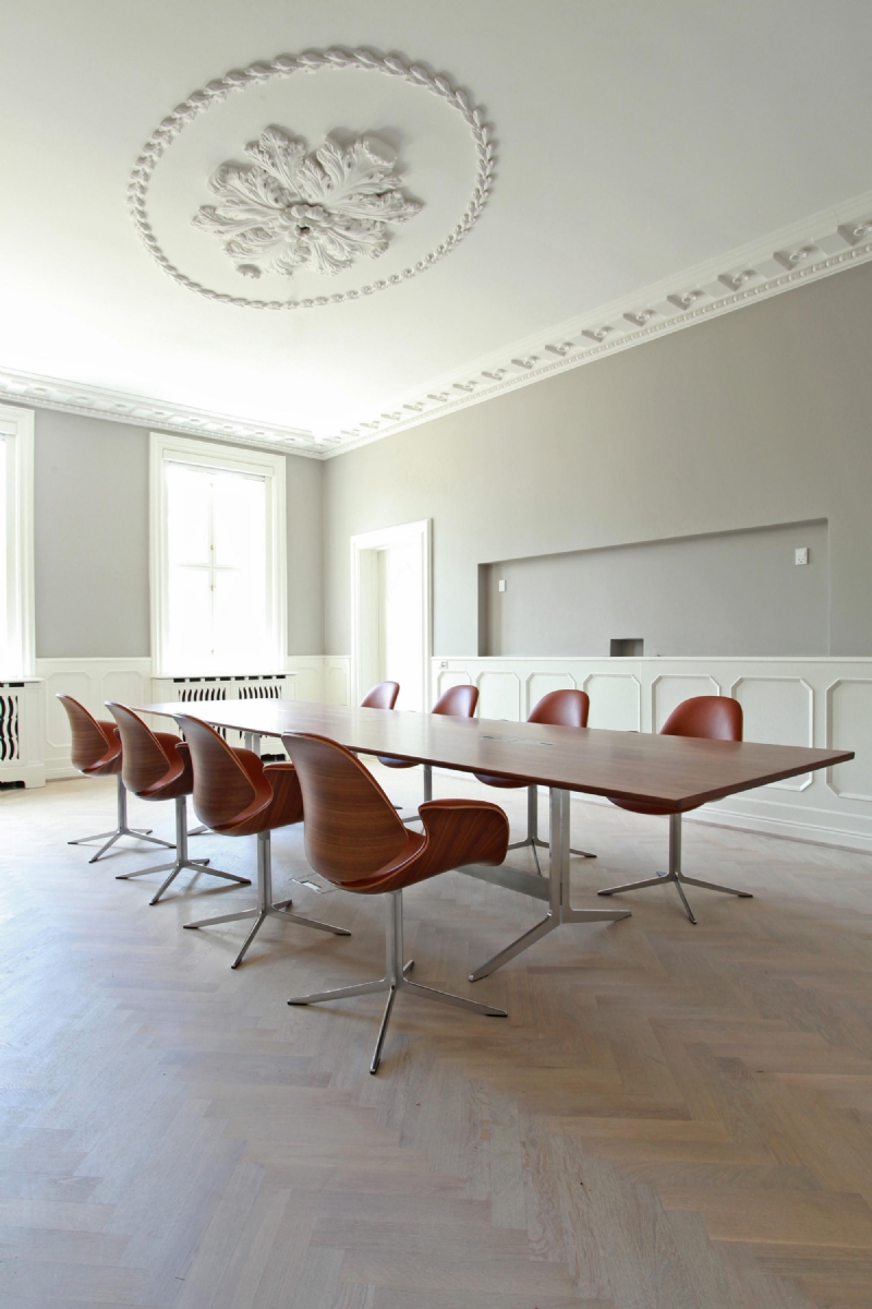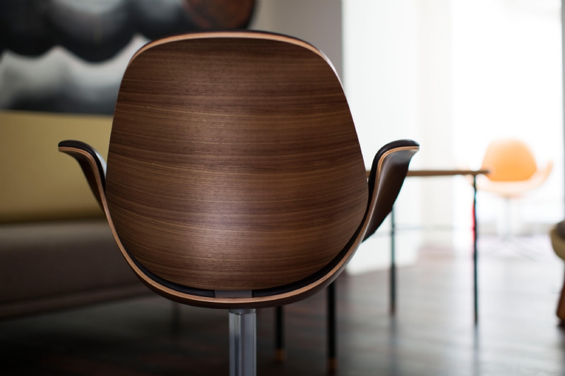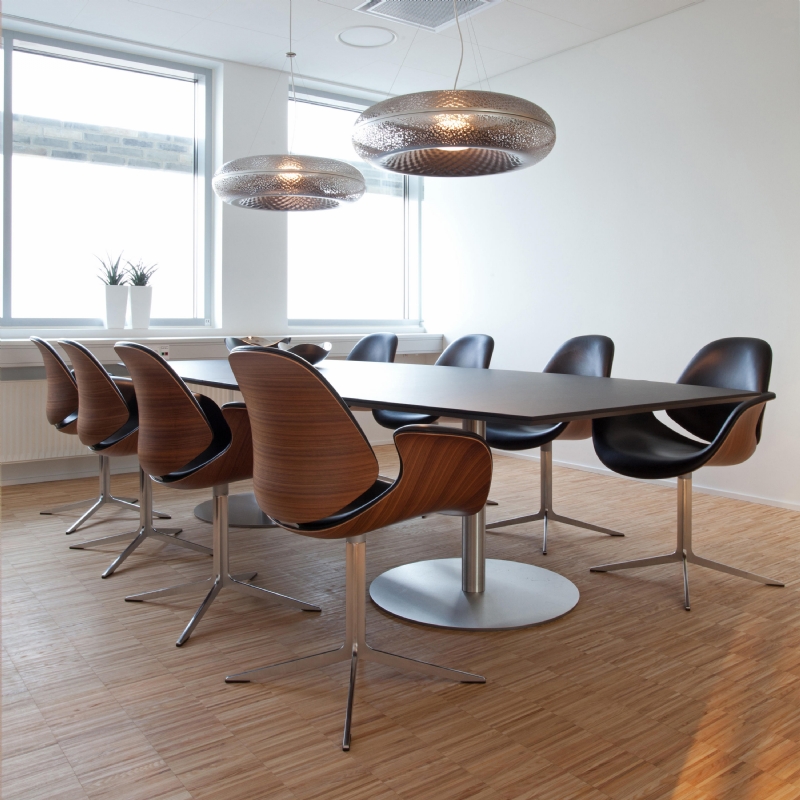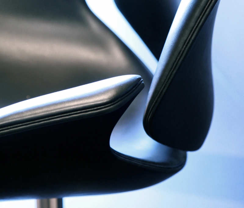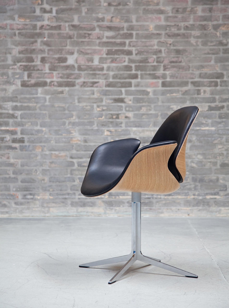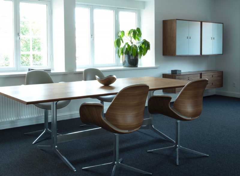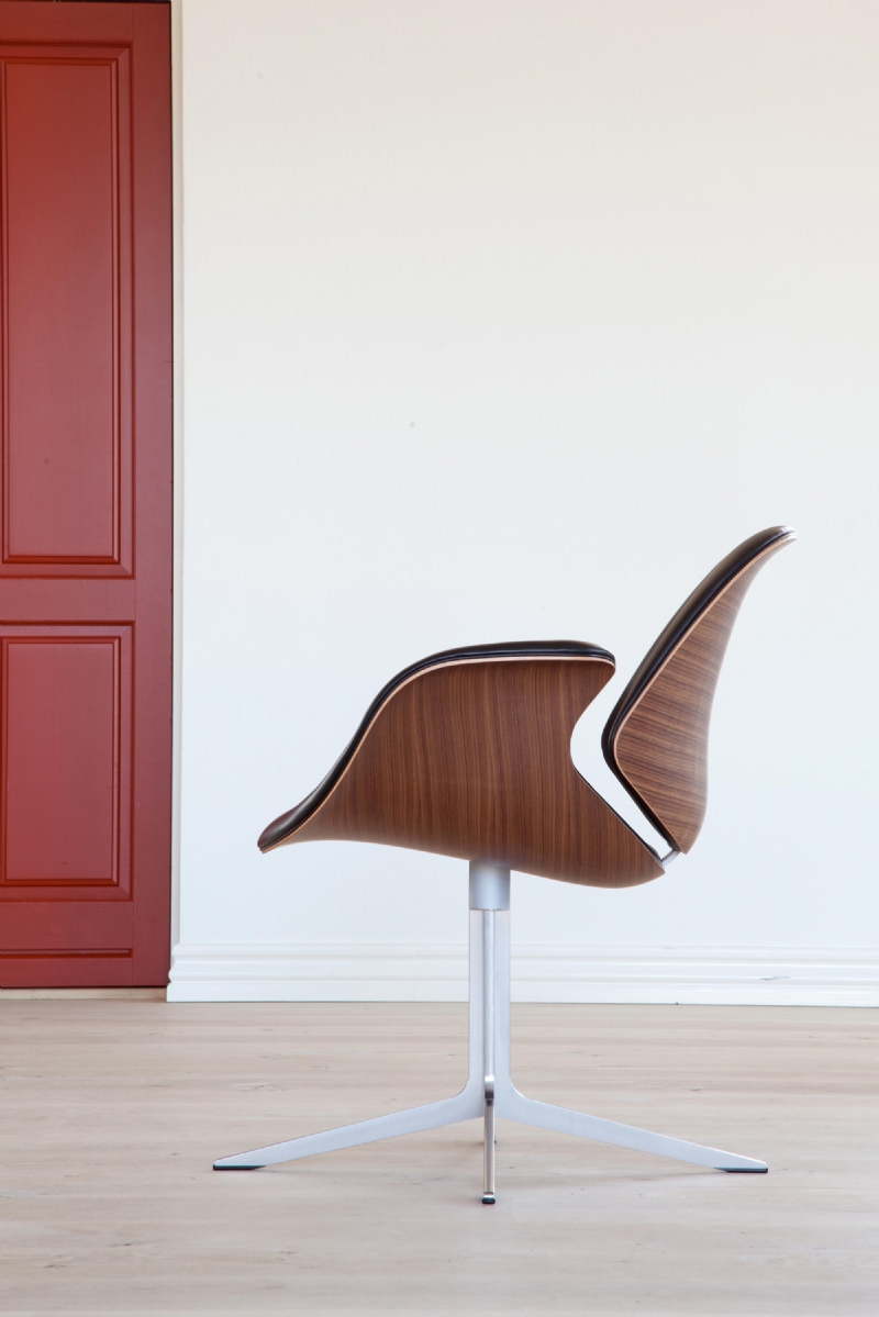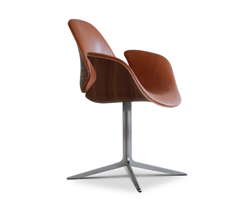 The chair is a construction of moulded 3D veneer in oak or walnut, upholstered with leather or fabric. The swivel base is cast in aluminium. ”Council Chair” is a new Danish design masterpiece – on the international design stage.