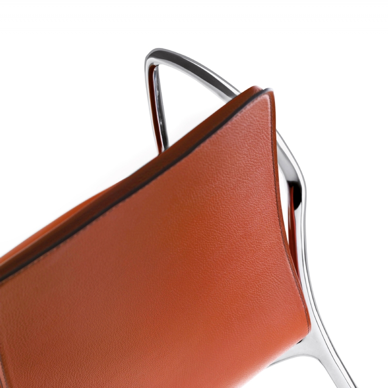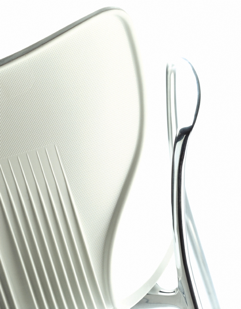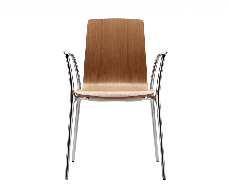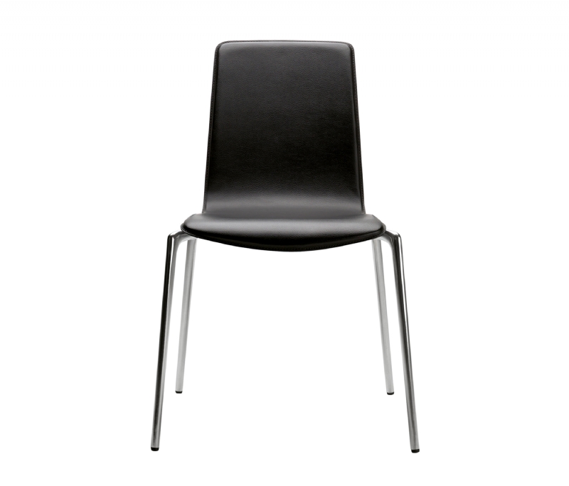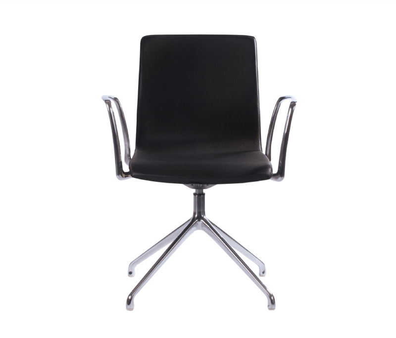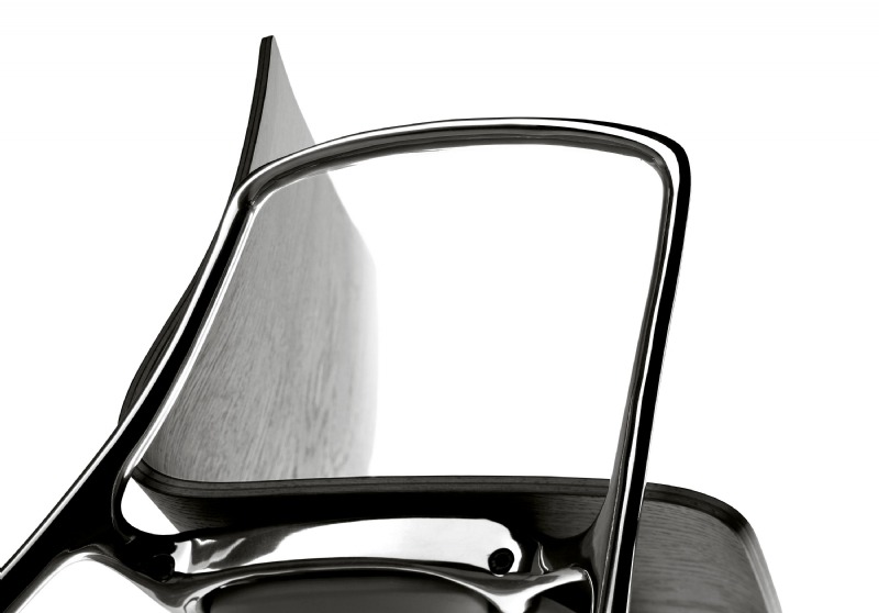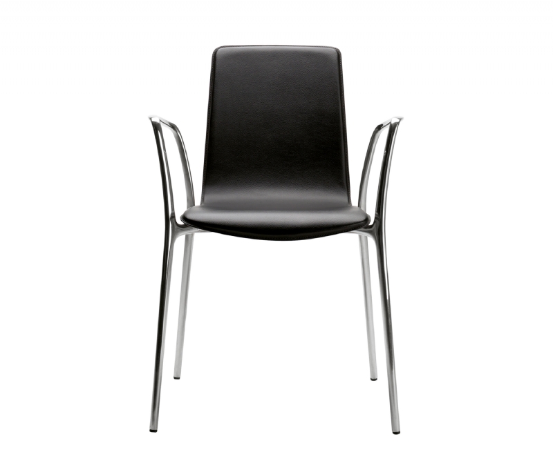 Stackable chair with or without arms, high-pressure injected aluminium structure powdercoated, polished or chromed. Shell options: polyamide-6 shell in one piece, supplementary front upholstery on seat and back, beech veneer shell (medium, high back, XL or lounge) varnished or upholstered in fabric or hide, or shell in one piece injected polyurethane fully upholstered in fabric or soft leather.