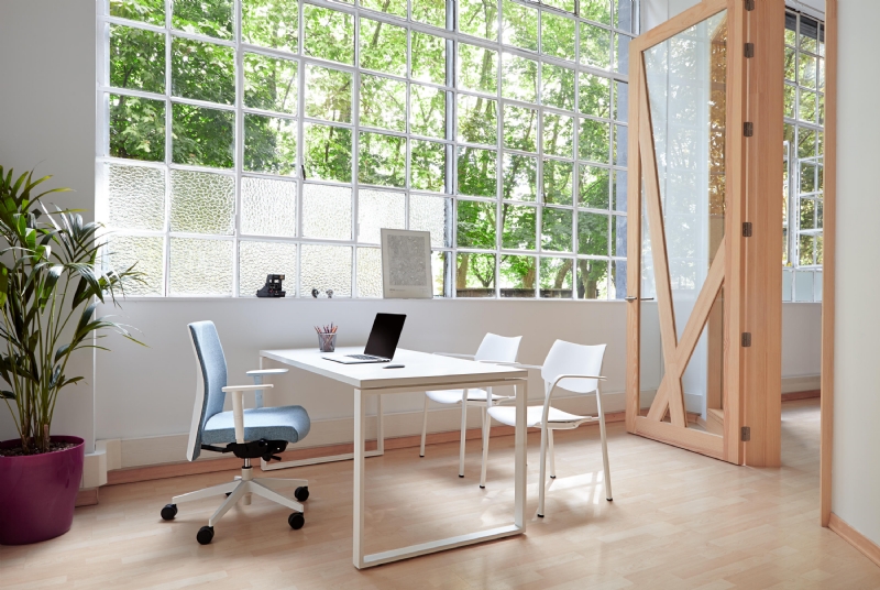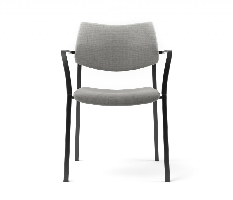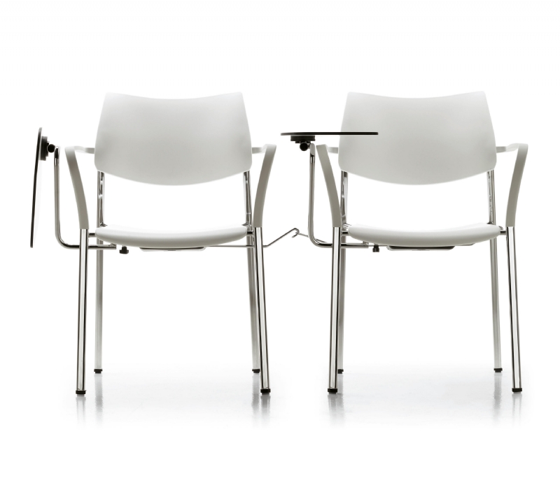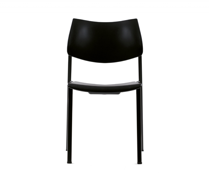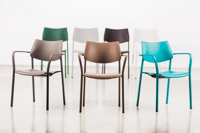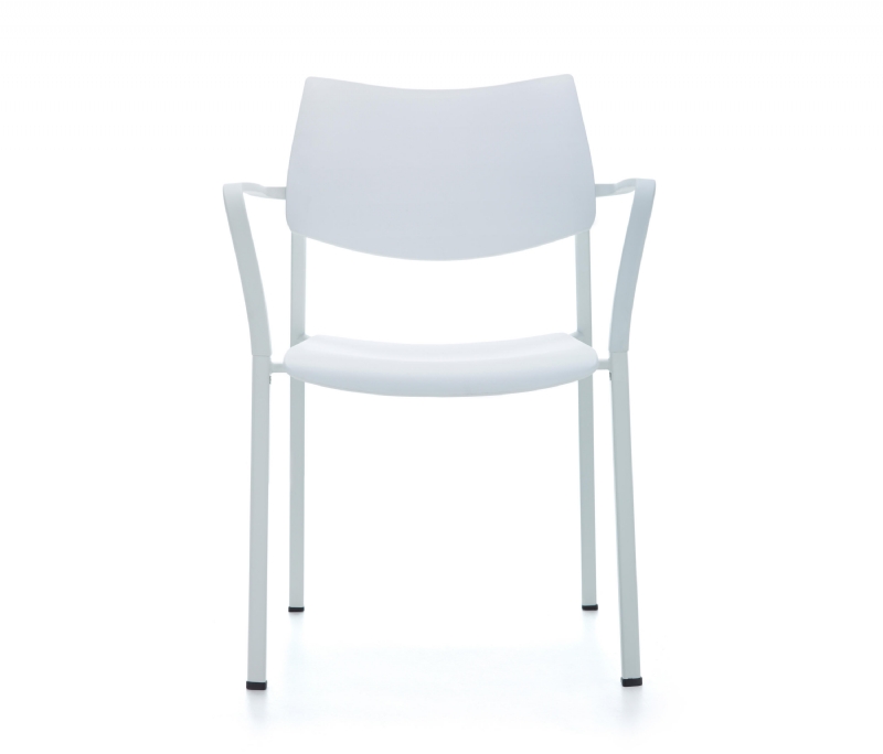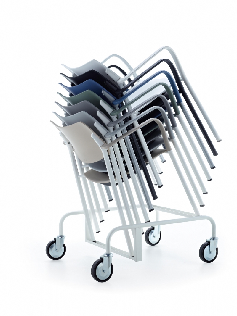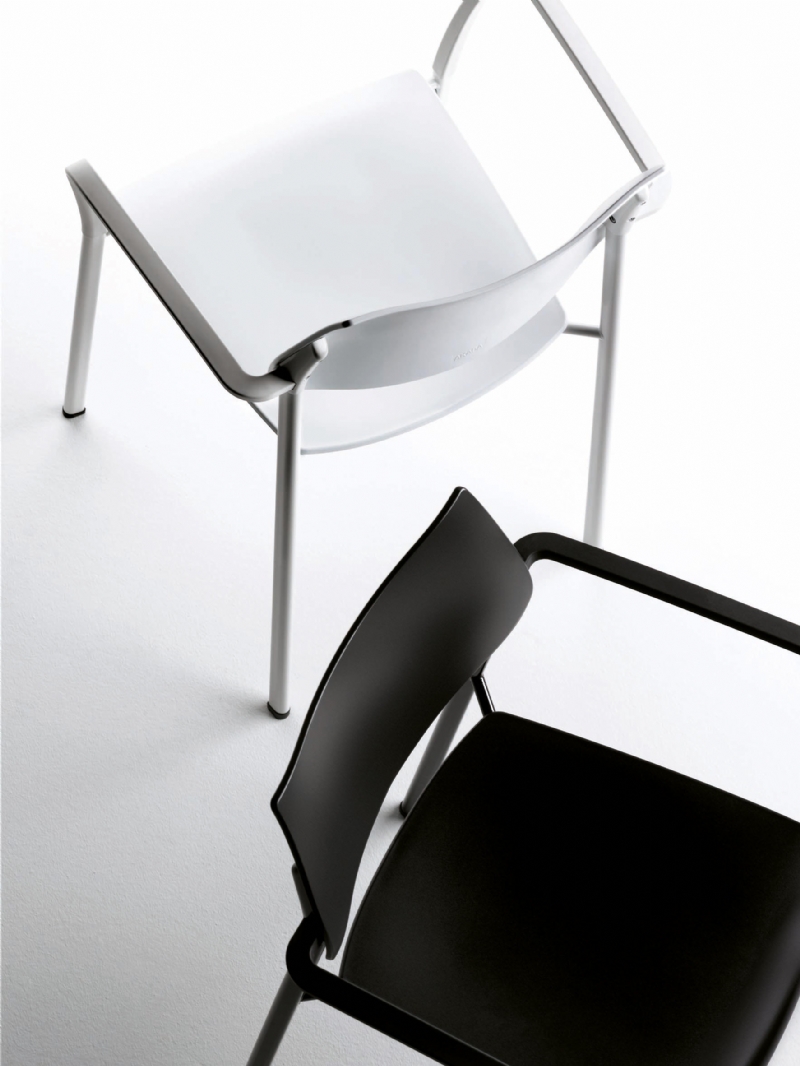 Stackable chair with or without arms. Structure in steel powdercoated or chromed. Seat and back in polypropylene, wood or upholstered. Arms in polyamide or in aluminium powderacoted or polished.